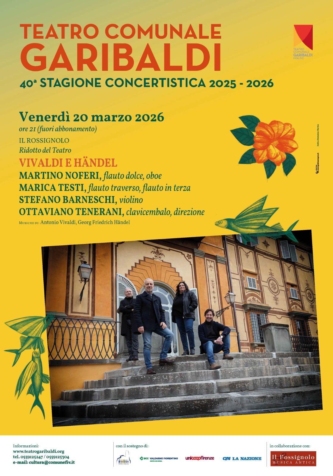Con questo concerto, entriamo nel mondo della melodia. Entrambi i compositori — Antonio Vivaldi (Venezia, 1678 – Vienna, 1741) e Georg Friedrich Händel (Halle, 1685 – Londra, 1759) — furono straordinari creatori di opere teatrali e la loro meravigliosa sapienza nell’inventare melodie indimenticabili li ha resi tra i più amati dal pubblico di allora come di oggi. Parlando di Vivaldi è certamente vero che grazie alla sua eccezionale creatività e sconfinata immaginazione riuscì a conferire alle sue composizioni, e in particolar modo al genere del concerto, una qualità espressiva e una raffinatezza senza precedenti. Contenuti assimilabili ai concerti da camera vivaldiani (Vivaldi usa il termine “Concerto” per queste composizioni per solisti senza orchestra e in genere per composizioni che prevedano una qualunque combinazione di strumenti) si ritrovano nelle fantastiche sonate a tre di Georg Friedrich Händel. Nel programma di questa sera si eseguiranno tre composizioni che Händel sembra aver immaginato esattamente per l’organico impiegato, e cioè per due flauti, flauto traverso e violino, flauto dolce e violino, il tutto sempre trasportato e sostenuto dall’immancabile basso continuo. Come per le composizioni di Vivaldi, i movimenti lenti sono fortemente espressivi e poetici, con una stretta interazione tra gli esecutori, mentre i tempi veloci sono emozionanti e drammatici, con una varietà di dinamiche e articolazioni mai scontate, che tengono sempre avvinto l’ascoltatore.